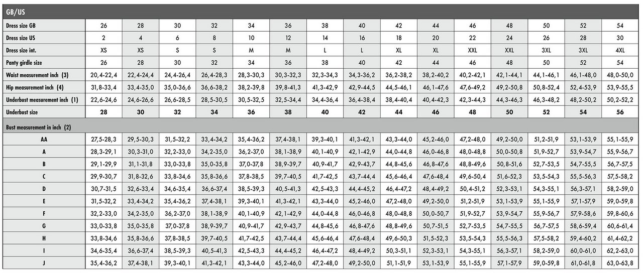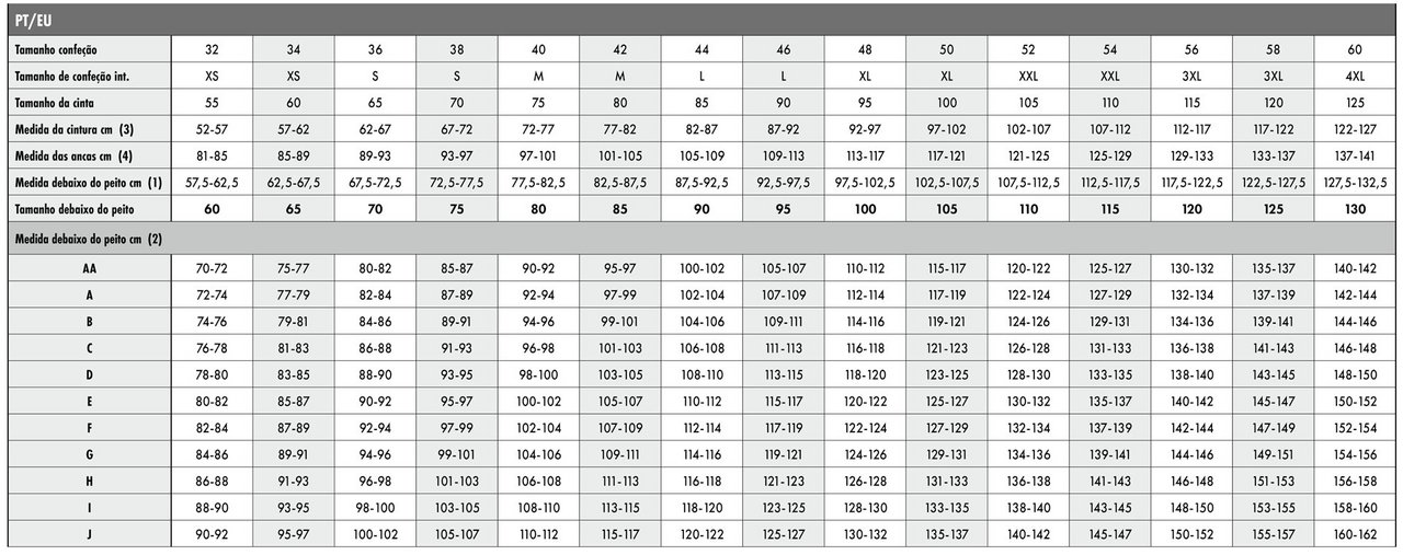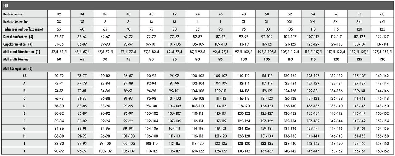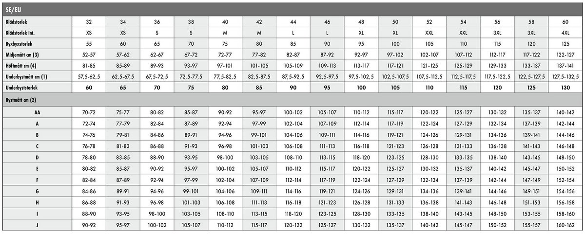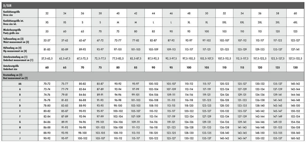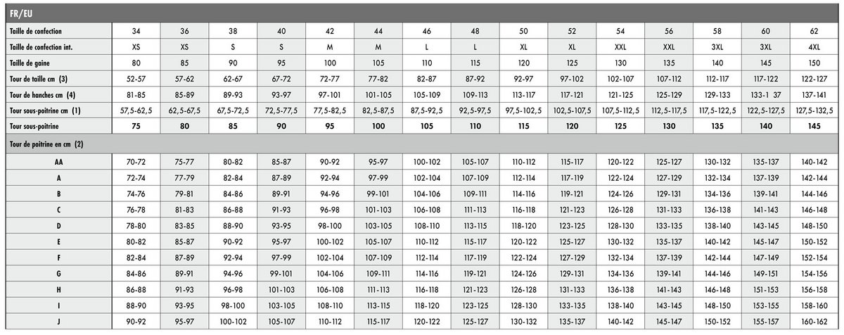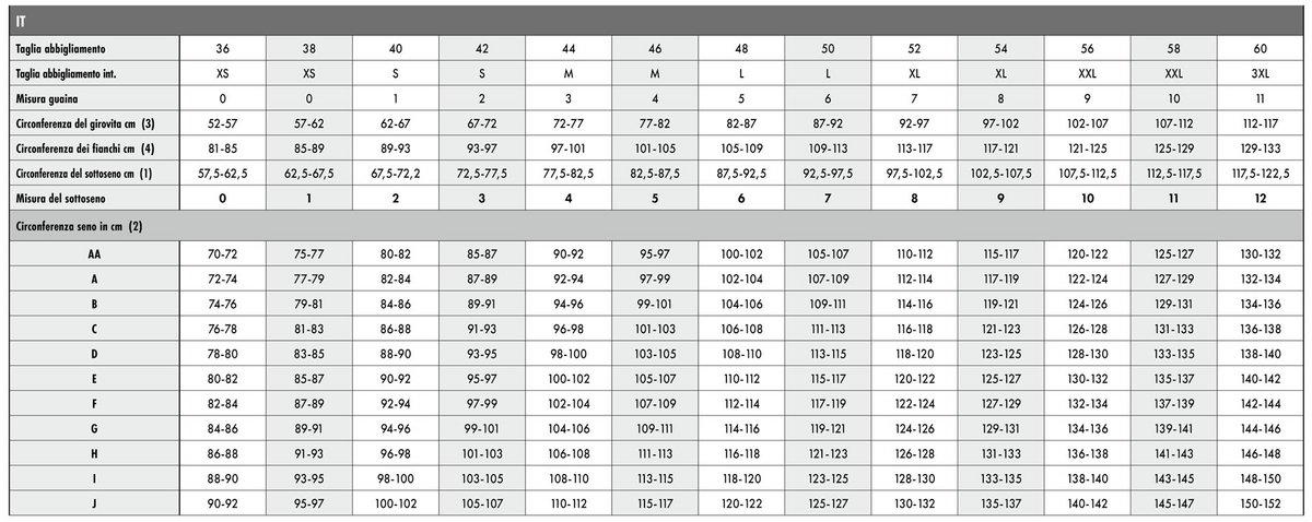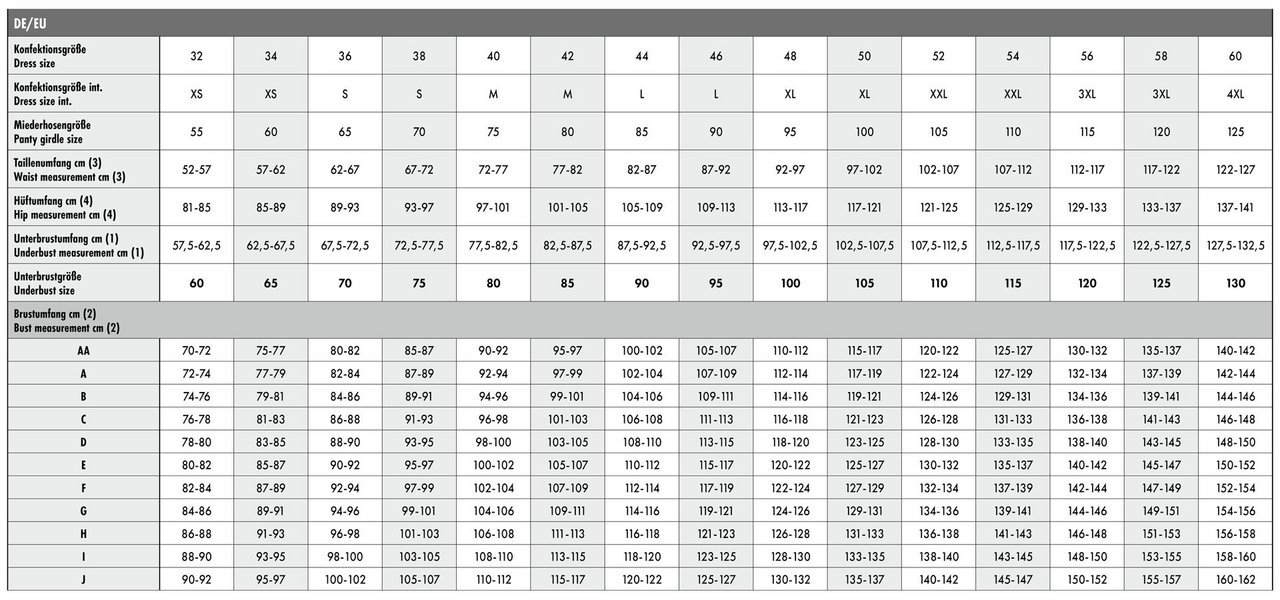 Take the measurement by holding the tape directly under the bust (1). This measurement determines
